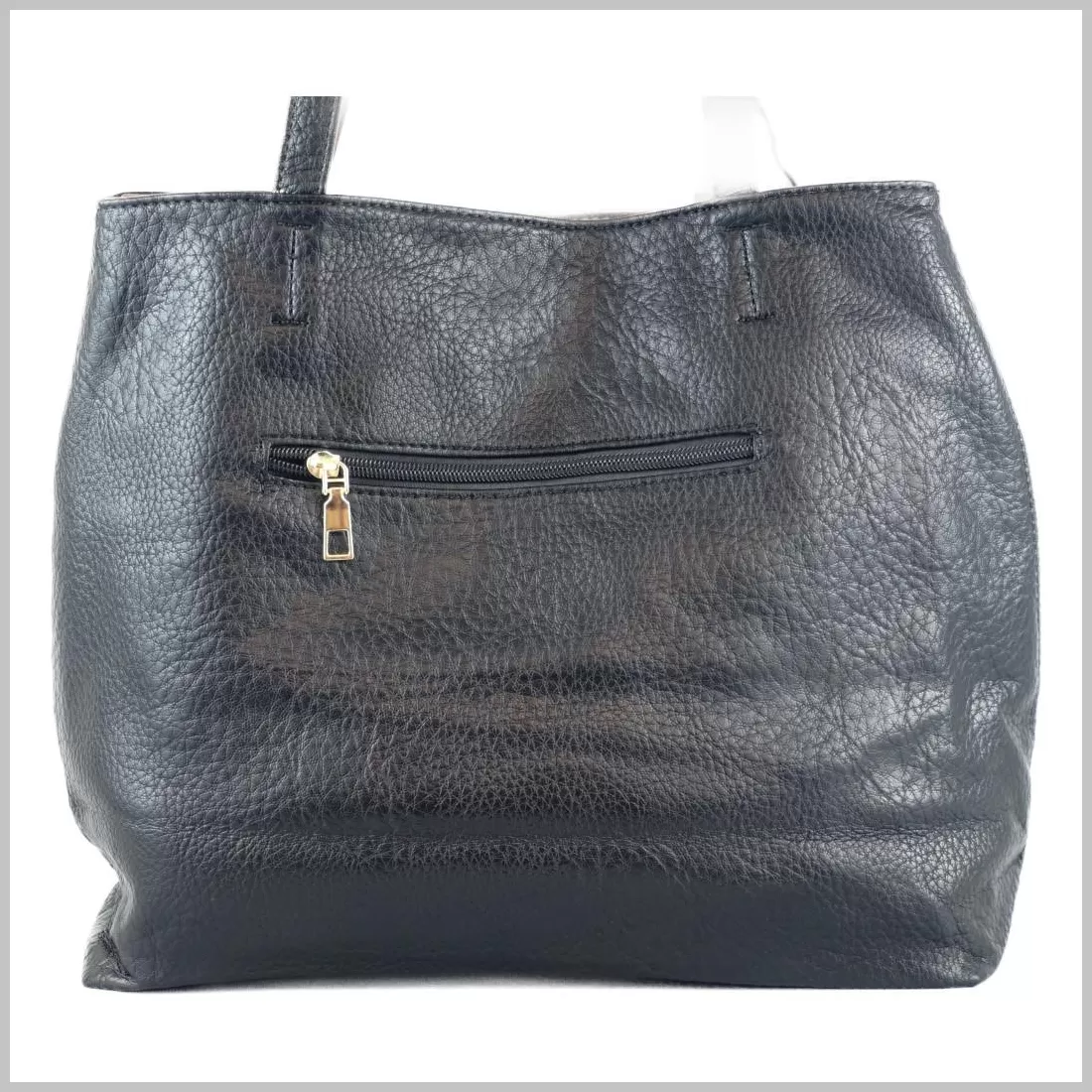 Egyszerű női válltáska karikával, műbőr, fekete színben. Anyaga puha műbőr, erős, vastag anyag. Hátulján cipzáras zseb. Tetején mágnessel záródik, tartozik hozzá egy neszeszer méretű kistáska. A tartozék hosszú vállpánt mindkét táskára felcsatolható. Méretei: 33×30×12 cm.