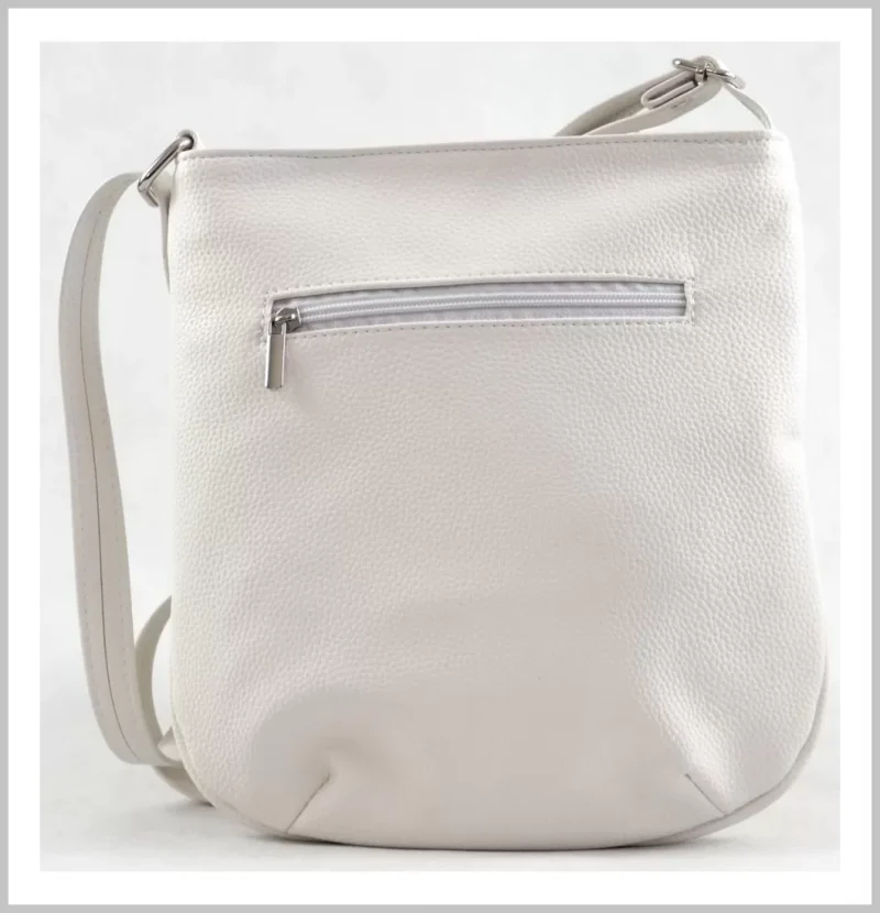 VIA55 női keresztpántos táska elöl kék sávval, rostbőr, fehér színben. Hátulján cipzáras zsebe van. Tetején cipzárral záródik, belül 2 cipzáras zseb. Méretei: 24×26×6 cm.
