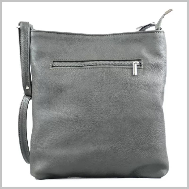 VIA55 női keresztpántos táska ferde zsebbel, rostbőr, khaki színben. Hátulján cipzáras zsebe van. Tetején cipzárral záródik, belül 2 benyúlós és 1 cipzáras zseb. Méretei: 27×30×4 cm.